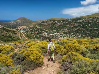 This morning you take a taxi to the nearby village of Remata to start your walk. Following a lush, shaded stream bed you ascend to the villages of Arni and Katakilos. Via a wide valley with terraced fields you walk to the hills above Batsi. After enjoying the great views, descend to Batsi and the sea. Alternative walk: if you didn't walk to Ano Pitrofos village yesterday you can take the morning bus to Paleopolis and follow the route above the coast to this lovely village before continuing to Batsi. Distance 11-12km (6.9/7.5mi), +400m (+1312ft) -600m (-1968ft)